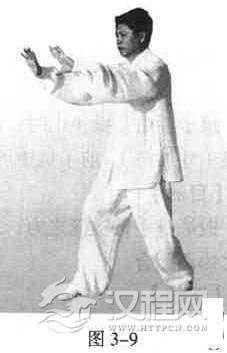 蹲身坐胯,重心移至左脚,右脚提膝前提,成右提膝步;同时双掌由两侧向前、再向里合掩(手心朝上),两手在前面交叉,两肘相合叠,向腹部双勒,双手由腹部勒至双肋,身正腰挺;右脚前踩成五五步;同时双臂外滚,同时向前翻掌发劲推出,掌心朝前,十指张开,两虎口相对,掌根外撑,两手微成八字形,双掌要有炸劲;松腰坐胯,沉肩坠肘,空胸紧背,两腿有撑力。还有一种发力形式,即在双勒时松腰坐胯,双掌推出时,身正腰挺,沉肩坠肘,操手时可细细体会。左右换步亦然。此为掩手推山势(图3一9)。