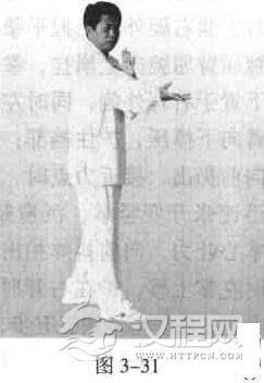 屈膝下蹲,成右提膝步;沉左肩,左手屈臂立掌护在胸前.右手直臂,手背朝上,由前向上反撩,高与头齐,随即翻掌.手背向下直腕、直掌向下醒气摔击,手停于手臂与身45度角处。反复练习。换手、换腿亦然(图3-31)