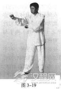 屈膝下蹲,右提膝步,右手手心朝上.微向前上屈臂指引;左手手心朝下,放于右前臂中间上面。右手臂向前、向内滚腕翻肘,同时右掌迅速握平拳微向右横揣击出,左手掌与右手同步外翻.握拳收归心口处,拳心朝上.左肩外翻,胯正身斜,脚踩五五步。身右转,裹左肩,左拳从右臂下右侧向前钻出,前臂微横,待钻出右拳梢时,迅速滚腕翻肘,微向左横揣击出;同时右拳与左拳同步外翻收归心口处,拳心朝上,重心后移右提膝步。左右反复操练(图3一19)