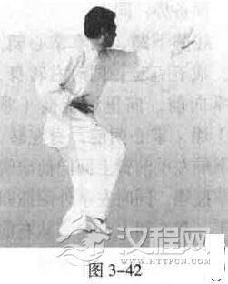 蹲身坐步,成右提膝步,右手立掌,屈臂裹肘前指,左手立掌屈臂,护于右前臂内侧中间;右手向前穿指,左掌松屈,顺右前臂上面.探背松肩向前上方抖炸拍出(正掌,手心朝前,五指张开),高与眉齐,右掌回搂至腹部,掌心向里;右掌顺左臂上面向前上方抖炸拍出,左掌回楼至腹前,脚踩五五步;左掌顺右臂下面.向前上方抖炸拍出,右手持手至腹前,变右提膝步;右掌顺左手臂下面.向前上方抖炸拍出.左手捋手至腹前,脚踩五五步。左右连环反复操之(图3-42)