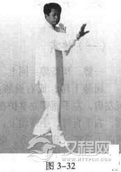 屈膝下蹲成右提膝步,沉左肩屈臂,左手立掌护于胸前;右手顺右腿外侧松握平拳,右腕屈臂屈腕向上崩挂,拳心朝下置于右耳外侧,同时左手屈臂向下撑压,护住档部;右拳向前扔出.接近力点时,五指迅速张开变竖掌,沉肩坠肘,掌心吐力,向前抖炸拍出;同时左掌上移,护在右臂肘弯内上侧;右脚落地成五五步,两腿、膝有撑力,浑身一整,气沉丹田。反复操之,换手、换腿亦然(图3-32)