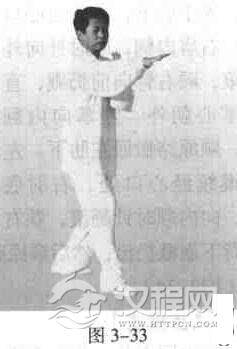 屈膝下蹲,右提膝步,右手立掌,微屈臂、裹肘前指.左臂撑圆.立掌,指尖向前,置于右肘下面;左手经右臂下外侧向上、向左直钟大圈手,手落左前方,同时右掌撤归肋下.虎口朝上;右腿伸直向前上撩,腿与胯平,脚面绷直;重心前移,右手从下向上经右耳侧向前、向下直臂平掌拍出.五指张开.指尖微扣,掌心空起朝下.手打扣劲,止于前下方.同时右脚踏地成弓步。左掌迎击右掌后,顺势撤归肋下.虎口朝上;重心后移,左臂同样经右臂外侧向上、向左大圈手。右脚撤回成右提膝步,右手撤归肋下;右手经左臂外侧向上、向右圈出,止于右前方,左手向右正圈,经右肘弯处撤至肋下;同时右脚落地,左腿直腿向前上撩,腿与胯平。脚面绷直,重心前移;左掌向上经右耳侧向前、向下直臂平掌拍出,五指张开,指尖微扣,掌心空起,朝下,手打扣劲,止于前下方,同时左脚踏地,成左弓步,右掌迎击左掌后,顺势撤归肋下,虎口朝上。左右轮换反复操之(图3-33),