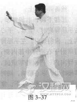 屈膝下蹲,右提膝步;左手直劈、直掌.掌背朝上,掌心斜向前,由下向前、向上挑撞,右手掌收于肋间,虎口朝上;右手直臂、直掌,掌背朝上,经左手下向前、向上挑撞;同时右脚向前踩落,重心前移,成五五步。反复练习,换腿亦然(图3-37),