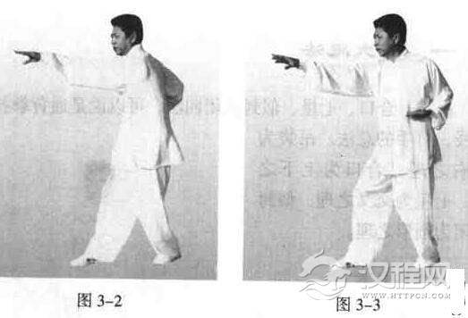 重心移至左腿,屈膝下蹲内扣;两手成凹拢掌放于肋下,掌心朝上,微外翻;右脚前落成三七步或前提成右提膝步(九一步).身正腰挺,舒胸下气,尾间中正,合膝裹胯,十趾抓地;同时,左臂顺心口处向前裹肘挤肋平伸至远,高不过肩.手心朝下,手指微扣,手腕松挺.成拗步势(图3-2);右臂顺心口处前伸;临至前手时,左臂裹肘挤肋撤回,两手交接时,同时滚翻.左手顺右手虎口处撤回肋下,右手松直,顺左掌轮前伸至远.手指要有探按劲,成顺步手(图3-3)。操手时两腿似有撑挟之力.松肩探背,呼吸自然,气涵养于丹田处,此为定步提膝吊袋之一个循环,随之连续缓缓操之。换脚亦然。