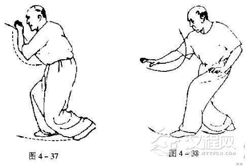 右手经胸前往上钻出,至与左手相遇时,即变掌向前下方将按,如鹰捉物。臂似曲似伸,左手亦同时下按拉回至小腹左侧,掌心向下;与出右手的同时,左脚前进一步,右脚跟进,脚跟欠起,右膝向下垂劲,眼看右手(图4一38)