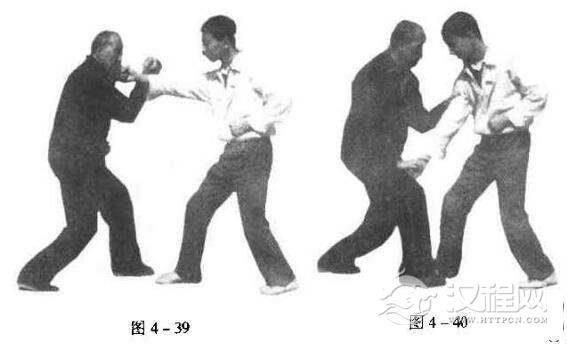 熊形为防守,鹰捉为攻取。熊形接手在对方腕部或小臂外侧,进击则是从对方肘窝之上进击。或者以右拳拗步接手(图4一39)。步不动,左手以鹰爪之力顺对方大臂向下打按,右手亦同时助之而向下采(图4一40)。若采之不动,即可顺其抵抗之势,速用右掌拗步进劈,往往可获胜算。