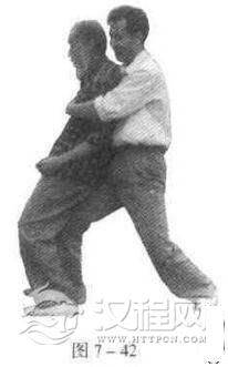对方从后抱住我腰时,我可先以科后击,使刘方之腹、档与我接触稍松,随即转腰以左4i肘连击其两肋(图7一42、图7-43、图7一44)