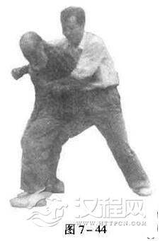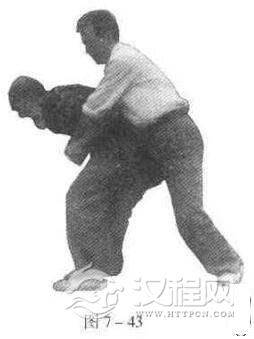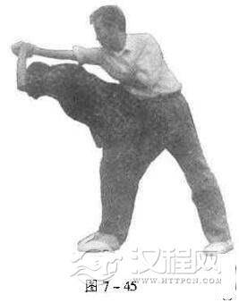 此为散打中“掷法”之一。当对方以右手顺步向我进击时,我以两手接其右臂,上步向右转身,以臀尾抵住对方小腹,急弯腰将讨方背起并向前掷出(图7一45),此动作要快,迟则尤用。