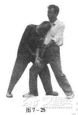 如对方以右冲拳向我进击,我即以右手接其右腕,左小臂向右下裹压其右臂,肩向右合,进左步以头击其右胸(图7一26)