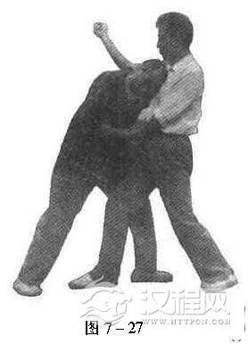 (1)正面双开撞胸。如对方以饿虎扑食或双风灌耳向我进击,我即以双臂上封外开;同时,前脚进步,以头击其胸(图7一27)。