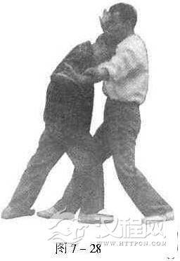 (2)单开撞胸,如对方以右冲拳打我面部,我即以右拳上挑,随即进步以头撞对方前胸,左拳置于我左额角以护面(图7一28)。