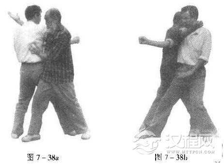 用自己的胯尖(股骨头)对准对方的胯尖,发萃劲,如同鲤鱼打挺(图7一38a、图7一38b)