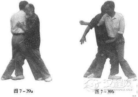 先顺对方来势:抢步中门,以里胯逼住,使之不能换势,然后以横劲击之。如果是右腿插档,用右臂向左横打为好(图7-39a,图7一39b)。如对方未离位,切勿发劲。用胯打,步法最重要,两足两腿之进退交换须自然得体,胯打始能奏效也。