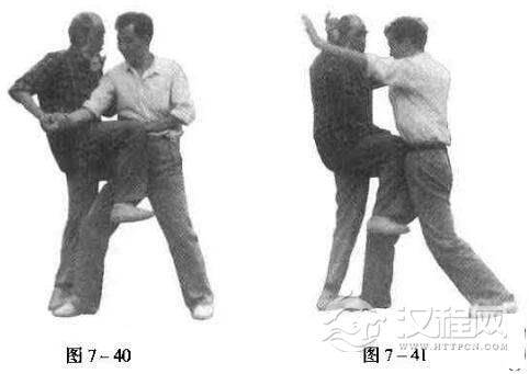 对方打右中平拳,我以右手接其腕,左手抚其七臂,向后下方将带,乘势从外侧上左足;同时,提右膝以顶其胸(图7一40).