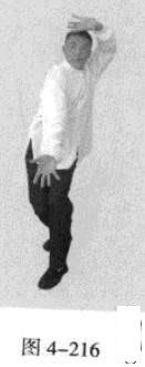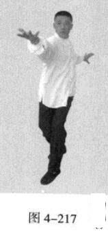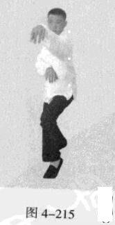 起势熊出洞。身体下沉蹲坐并吸气,全身蓄力如待发之箭,接着以头领身.脚下蹬地,腰部也随之向左旋转;同时,左右手做立圆运动,左手的立圆运动是从熊出洞的姿势开始,先向前上方,再向后下方,做逆时针划圆运动,如此便形成从前向后的立圆运动。手臂向后时可以伸展开,但不能完全伸直。当左手臂由上向后下方做运动时,右手是由下向前上方运动的.如此才能形成前后、上下、左右的矛盾对争力。发力的作用点定在哪里.劲力的炸点也就爆发在哪里。当右手臂运动至前上方时,劲力就可以爆发。身体成左脚在前之拗势姿势,身体要极力扭转,如此才能形成逆势的肩与胯合、手与足合、肘与膝合。外形的合劲在达不到要求的时候,内意之三合更将是相差十万八千里,无从谈起了。(图4-215-图4-217)