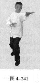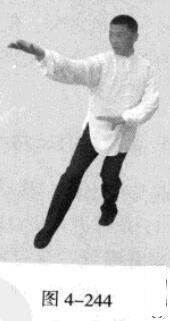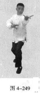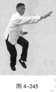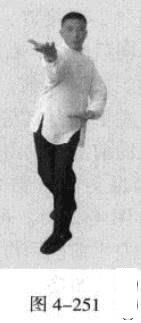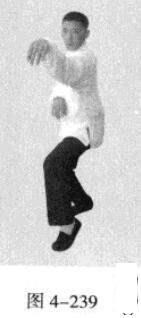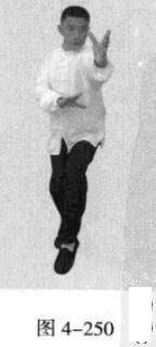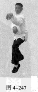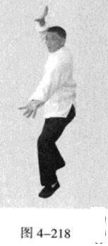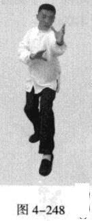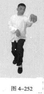 起势熊出洞。身体微下沉蹲坐并吸气,紧接着,左脚蹬地.使身体向后平移,右脚落地后五趾抓地,左脚在前.脚尖着地;同时,左手从上向左下劈击,紧接着又向前上方发力并呼气。此为后脚退步前手发力技巧(图4-247-图4-249)。可连续发力,也可先左手前撩后再下劈,仍为海底捞月。图略。