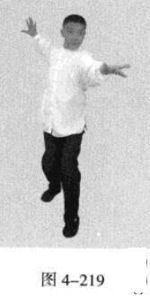 承上式。以头领身.脚下蹬地.腰部随之向右旋转;左右手仍然在做立圆运动。右手的立圆运动是从前上方向后下方,左手的立圆运动是从后下方向前上方,如此便形成了前后、上下、左右的矛盾对争之力。当左手臂运动至前上方时,劲力的炸点在瞬问爆发,右手臂在后方与前面之左手臂形成对争力,身体成左手足在前之顺势姿势,如此便形成了顺势的肩与胯合、肘与膝合、手与足合的外部三合。(图4-218,图4-219)