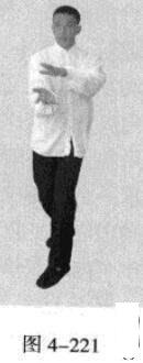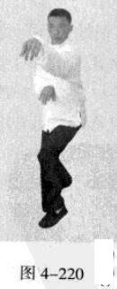 【说明】由于为了让大家看清楚发力的运动轨迹,有一些动作已明显做得比较夸张了。提醒大家注意的是,最初的训练是允许这样的,熟练后.后手可不必向后伸展,可护于胸前或胁侧,以便更适用于实战的要求,如下图(图4-220-图4-224).这几个动作仍是前面刚讲过的海底捞月定步定位发力。在右手发力时,左手划很小的一个圆就直接护于胸前了。右手的运动轨迹也是非常的小,儿乎是走直线发出去的。所以对于本书中一切的技术,均可以以此类推,由此便可以隐藏所有发力中的运动轨迹。