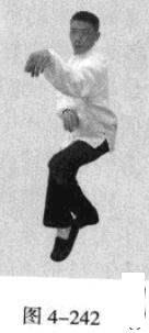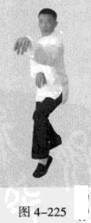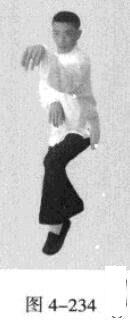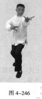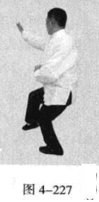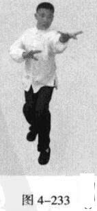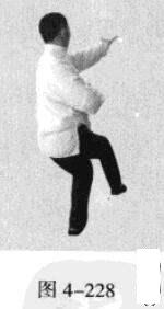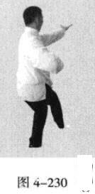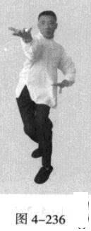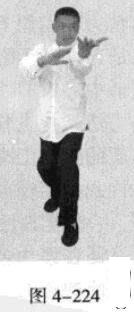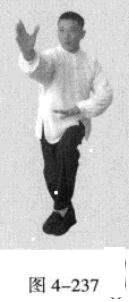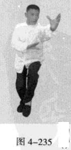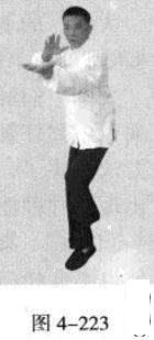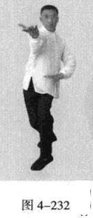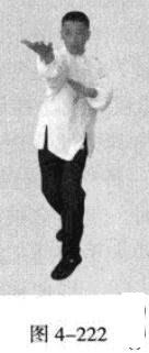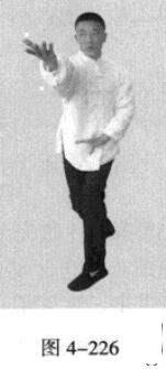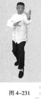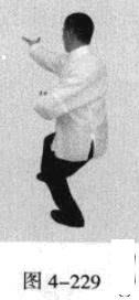 动作不停,身体向右后转体180度,以头领身,身带步,使右脚向前踩出一步,左脚随迫半步,成立身中正之势,以保持重心的稳固;左右手仍做立圆运动不停。在转身踩步同时,右手从上往下斜劈,按护于胸前,左手向前上方发一把上撩之劲;此时,右脚在前,身体成拗势逆合(图4-227,图4-228)。紧接着.腰部向左旋转;左手向上划立圆后按护于胸,右手向前上发一把上撩之劲。此为右返身左右手的多次发力技巧(注:发力同时步法可以再次向前移动)。身体成右手足在前的顺势顺合之势。(图4-229)