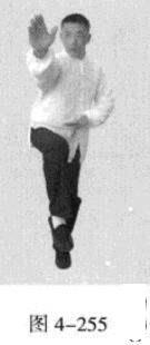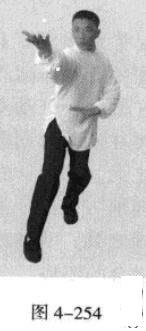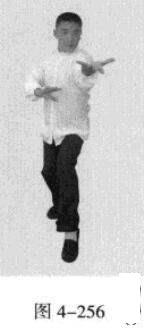 接着右脚提起,左脚蹬地,使身体向后平移.右脚落地;同时,右手划圆按护胸肋部位。左手做向前方的撩击并呼气。(图4-255、图4-256)