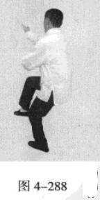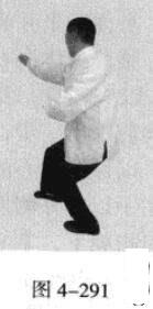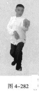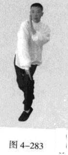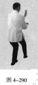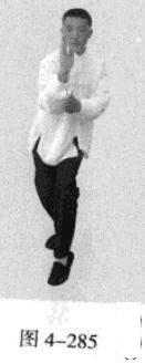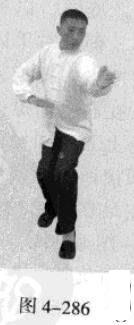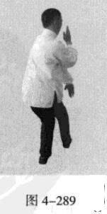 动作不停,腰部向右旋转,催动左手并拢成插掌,以指尖部位发力向前插击,在左手插击发力的同时,右手从前下方向上划一立圆,收回右侧腰际,身体成左手、足在前的顺势身姿。(图4-285、图4-286)