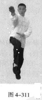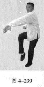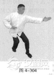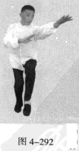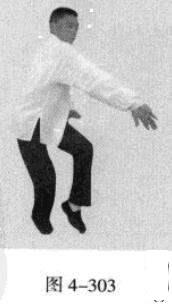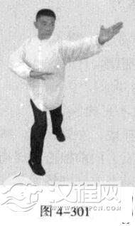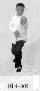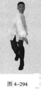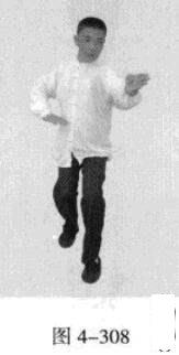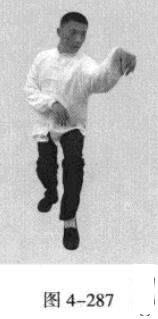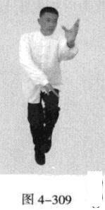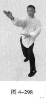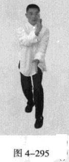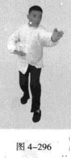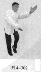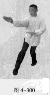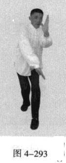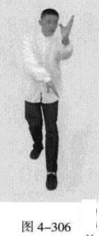 承上式。移动重心向前,以头领身,身带步,右脚向左前方45“角探进一步,脚尖着地,左脚悬脚虚提于右脚内侧;同时,左手从前上方向回经面部往下划一立圆,右手以掌外缘发力向前撩击,拇指朝下.掌心向右(图4-301一图4-303)。紧接着.左脚过右脚向左前方45度角踩进一步,脚尖着地,内扣15度,右脚随迫半步.成立身中正之势,以保持重心的稳固;同时.左手成插掌向前插击,身体成左足在前之顺势身姿。(图4-304)