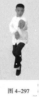 起势熊出洞。移动重心向前,以头领身,身带步,左脚向左前方45度角踩进一步,脚尖着地,右脚悬脚虚提于左脚内侧;同时,右手从前上方向回经面部往下划一立圆.左手以掌外缘发力向前撩击,拇指朝下,掌心向左(图4-297-图4-299)。紧接着,右脚过左脚向右前方45度角踩进一步,脚尖着地,内扣15度,左脚随追半步,成立身中正之势.以保持重心的稳固;同时,右手成插掌向前插击.身体成右足在前之顺势身姿。(图4-300)