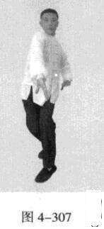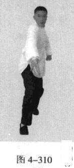 承上式。身体微下沉蹲坐并吸气,右脚蹬地,使身体向后平移.左脚落地后五趾抓地,右脚在前脚尖着地;同时,右手以掌外缘发力向前撩击,拇指朝下,掌心向右,在右手前撩的同时,左手从前上方向回经面部往下划一立圆,拉回左侧腰际,身体拧转成右足在前之顺势身姿(图4-309、图4-310)。