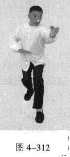 动作不停,左脚蹬地.使身体向后平移,右脚落地后五趾抓地.左脚在前.脚尖着地;同时,左手并拢成插掌,以指尖部位发力向前插击,在左手插击发力的同时,右手向上划立圆,收回右侧腰际并呼气.身体成左手、足在前之顺势身姿(图4-311、图4-312)。此为前脚连续退步七星发力技巧。
