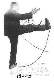两手向左右分开,由身体两侧向下、向里划弧至胯外侧时,即向前上方托起,掌心向上;与掌上托的同时,右脚向上踢起,与手同高(图4一53)