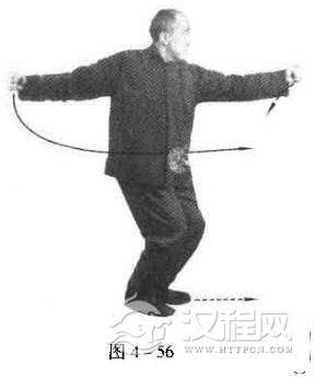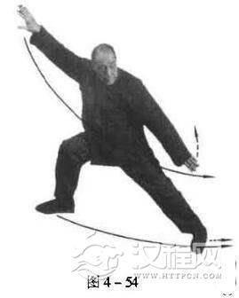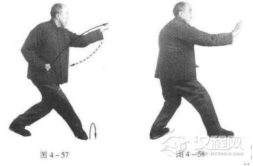 右脚抬起,转至脚尖向前落下,右乎同时散掌向前劈出,如问打“鹰捉”一般(图4一58)