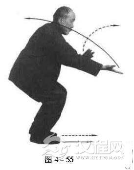 身体向左(即前)伏身而进,右脚进至左脚前方,踏实;左脚跟进,提起变虚;与伏身前进的同时,右掌自下向前捞起,手心向上,高与挡平;左手抚于右腕上,眼看右手(图4一55),谓之“燕子衔泥”之势也。