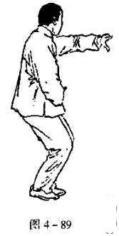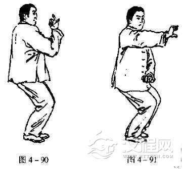 随即右手贴身上攒(图4一90),向右前方横击出去,腰向右转;右脚向右前方进一大步,左足随之,提起与右跺骨平,紧靠右腿内侧.眼看右手(图4一91)。如此左右轮换练习。