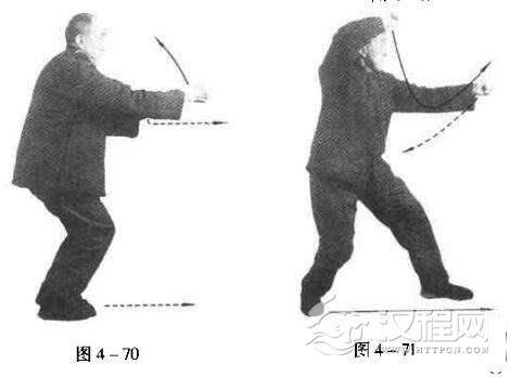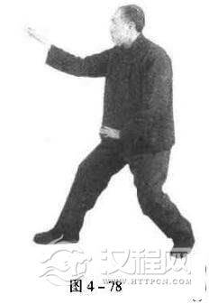 右脚向后一蹬,前脚前进,右脚再极力向前拥进,立定;左脚提起,紧靠于右踝侧。此之谓“疾进”。与右足疾进的同时,右拳平直向前崩出,左手抚于右小臂内侧,眼向前看(图4-70)