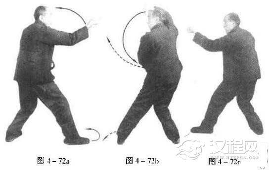 再进右脚.打右式钻拳(图4一72a、图4一72b,图4一72c)。此三个式子要连续打,一气呵成,束身而进.手脚齐起齐落,方能体现鹞子束身穿林之巧也。