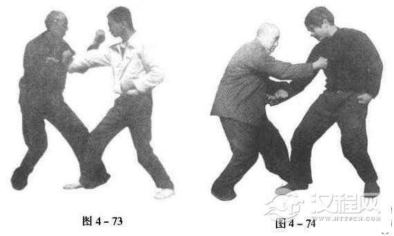 遇对方以拳掌来击之时,我右手土攒、引化,腰微向右转,侧身以避其锋,左臂缠绕而进,自对方外侧接住其大臂,两肩用合扣之力.将身子束成一根细杆,可无隙而不入也(图4一73)随即出右拳,低可打腹,中可打鸠尾,高可打华盖(图4一74)至于是左脚进过步还是右脚进疾步,需视对方后退与否而定。