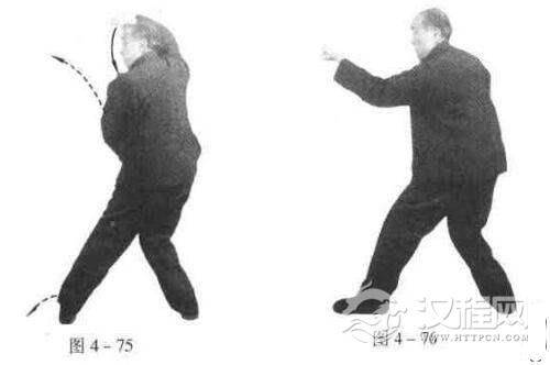 此时若又有敌自背后来攻.我可将前脚向里扣,急转身(左转,图4-75),右手自面前下扣,左手从右手上攒出,取面(图4一76)。亦可以用钻拳打对方下颏,其危自解。