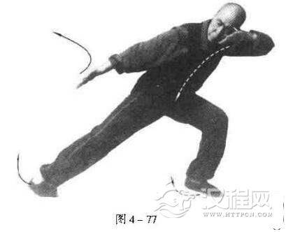 另一方法是:左脚向前迈一步以缓和对方的攻势,随即身向前伏;右手顺右腿向后插出,左手护面,眼向后看(图4一77),势不停,向右转身,右臂自外向上缠绕,接住对方进击的胳膊,如同“截手”一般(图4一78),然后可用掌或用拳,根据形势之需要而进击。以上乃鹞子翻身之巧也。