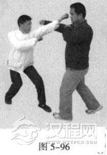 1.敌左势,右摆拳击我头部。我左势,左手握拳由中线直击敌头部,右手在下护肋。(图5-95,图5-96)