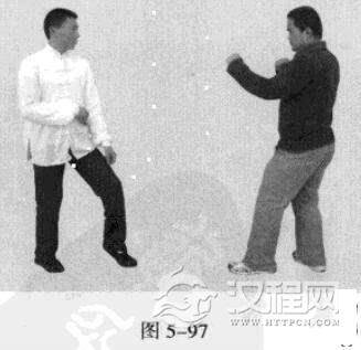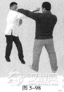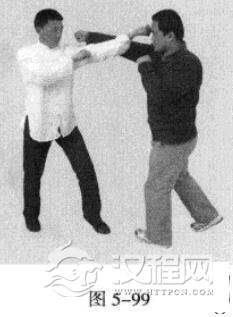 2.敌左势,以左右直拳连续击打我头部。我左势,也以左右拳做连续攻击,一手出一手回,回收之手护于肘侧。我攻击之手.目的是在挫开敌人手臂的同时击打敌人头部。(图5-97-图5-99)