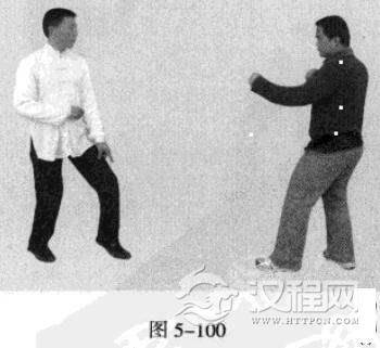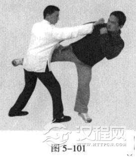 3.敌以鞭腿扫击我、中上盘。我左势,右脚过左脚抢人敌方中门,右拳钻打敌人头部,一击必翻。(图5-100,图5-101)