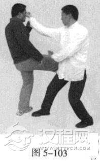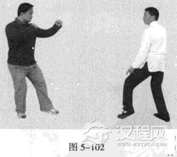 4.敌以左势正蹬腿击我中、上盘。我左势,左脚向左前方稍稍移动一小步.避其直力,紧接着右脚过步踩敌中门,右拳钻打敌人面部。(图5-102、图5-103)