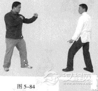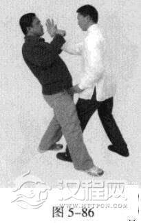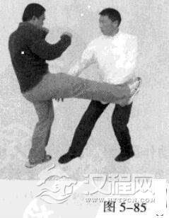 1.敌左势.以右鞭腿击我。我左势,左脚向前猛进踩人敌方中门,左手捋带敌人右腿内侧,同时右掌撩打敌人档部(图5-84,图5-85).紧接着,左手又猛力击打敌人腹档部位。(图5-86)