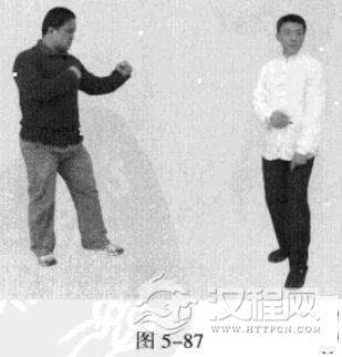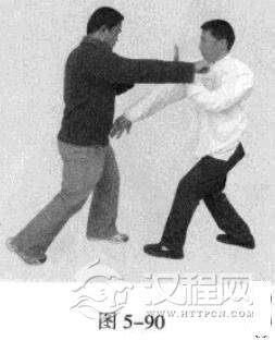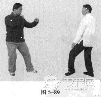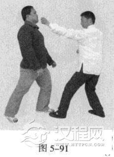 3.敌左势.以右拳击我头部。我左势,左手顺其力捋带其右手臂,以右手撩打敌人档部.紧接着左拳击敌头部。(图5-89-图5-91)