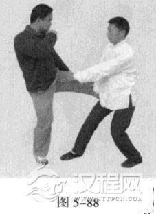2.敌人在我身体右侧以左脚蹬踢我身体中部。我左势,以左脚为轴心.身体向右转身,右手由下随身体的转动做一圆形运动,形如圆规所画之圆,右手臂持动敌方攻来之腿.将其来力卸掉,同时,右脚向前踩进一步,左手插掌插击敌人档部。(图5-87,图5-88)