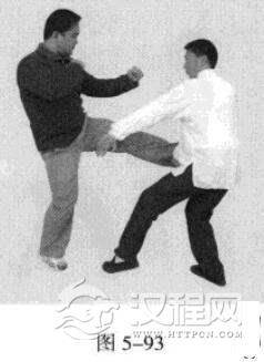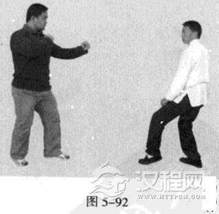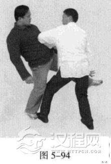 4.敌左势.左腿弹踢我腹、档部。我左势.左脚向前猛踩一步,左手贴敌之大腿撩敌档部(图5-92,图5-93),若手撩未中,便紧接着左肘击敌胸部。(图5-94)