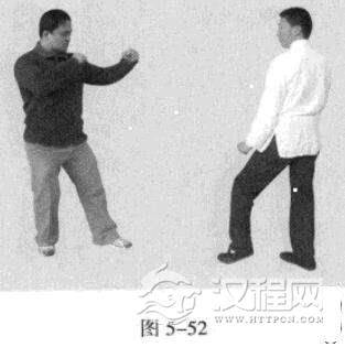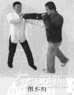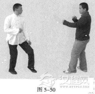 1.敌右直拳击我头部。我左势,左脚向左侧前方踩进一步,右手顺敌来势向后方挤带,一将即松,同时左拳由敌人臂下以拳眼处或拳棱处如鞭子般击打敌人胸肋部位。(图5-50,图5-51)