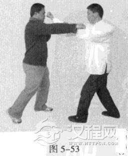 2.敌右直拳击我头部。我左势,左手下拉敌右臂,右拳钻打敌人面部(图5-52、图5-53),紧接着,右脚快速向前踩进一步.入敌中门,同时右拳由直击变为向右侧发力.鞭击敌右侧颈动脉。(图5-54)