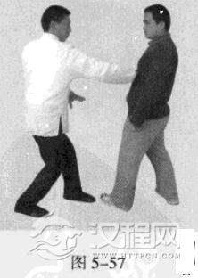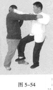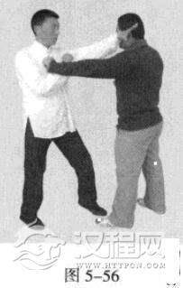 3.敌左手抓持我胸部衣服(图5-55)。我左势.腰部先向右侧旋转,双手臂部向右下拨压敌人抓持之手臂.猛然腰部左旋.以左拳鞭击敌人左侧颈部(图5-56),紧接着右拳鞭击敌人胸腹部。(图5-57)