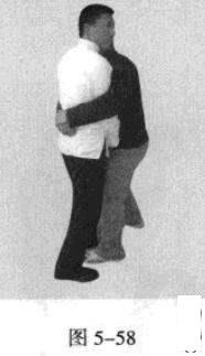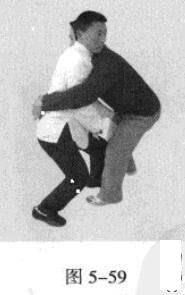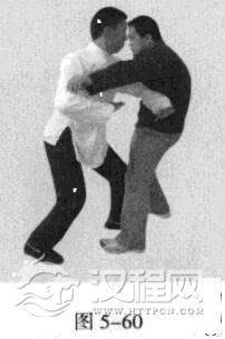 4.敌山正面连身带臂将我抱住(图5-58)。我身体向下沉,五趾抓住地面,先以手击敌档部(图5-59).接着,两臂猛然前后分开,以肘部对准敌人胸腹部发力击打。(图5-60)